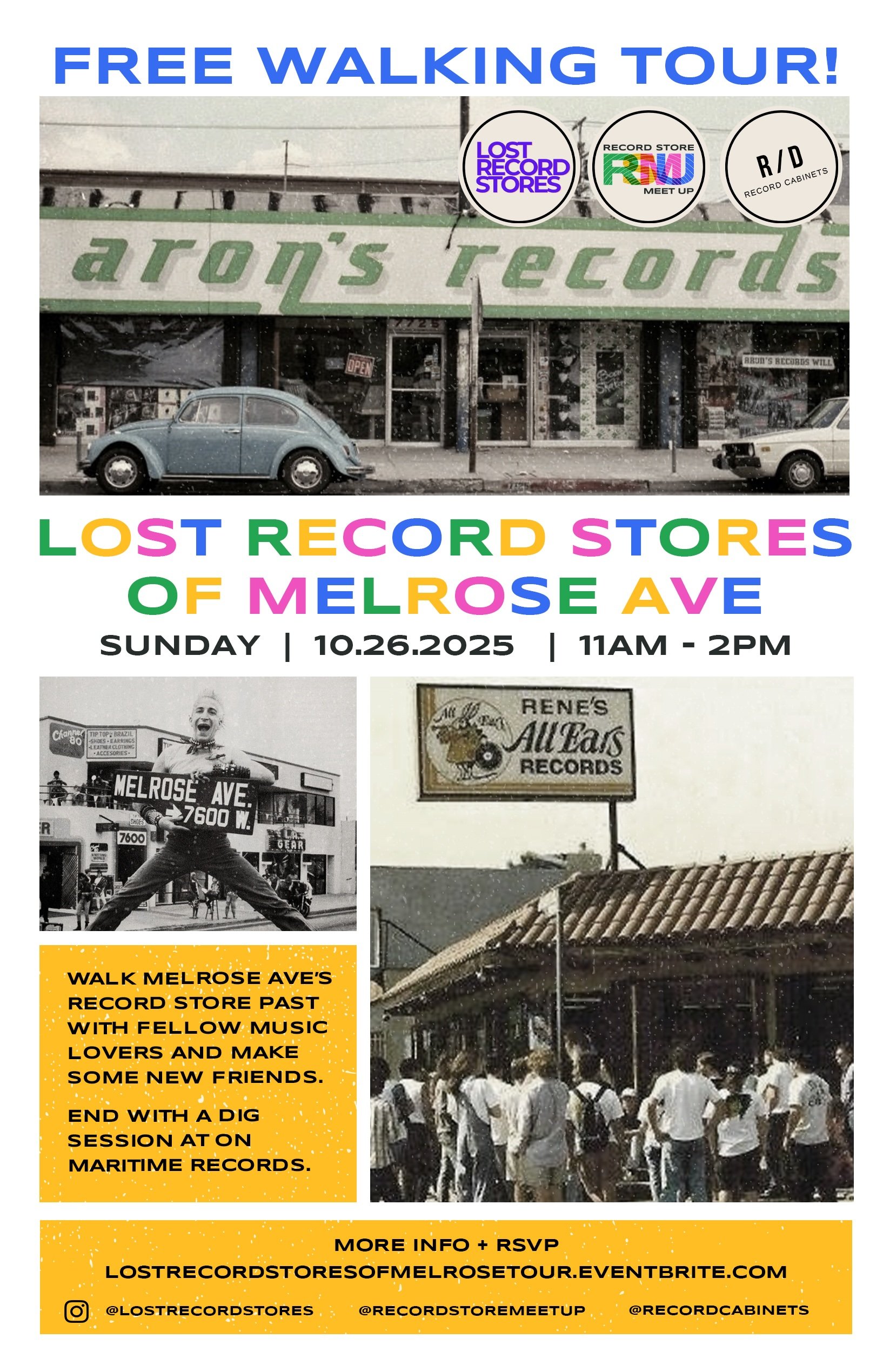 On Sunday, October 26, 2025 we are hosting a free walking tour of the lost record stores of Melrose Avenue in Los Angeles. From 11am-2pm.